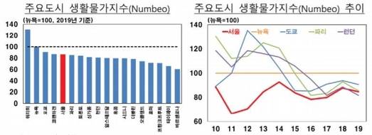 영국의 경제전문지 이코노미스트(Economist)의 산하기관이 발표한 생활물가지수는 서울과 뉴욕이 100으로 동일했다. 서울에서 빵 1kg은 15.6달러로, 뉴욕(8.3달러)보다 가격이 더 높았다. 다만 정부의 정책에 영향을 받는 교통, 통신, 교육비는 서울이 저렴했다. 넘베오의 통계를 기준으로 1분당 통화료와 인터넷 요금은 뉴욕 대비 3분의 1을 조금 넘어섰으며, 유치원·어린이집 교육비는 15%에 불과했다.