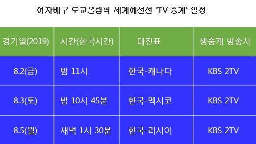 지상파 방송사인 KBS는 한국 여자배구 대표팀이 출전하는 '2020 도쿄 올림픽 세계예선전 E조 대회'의 한국 팀 전 경기를 KBS 2TV 채널에서 생중계한다고 대한민국배구협회에 알려왔다.