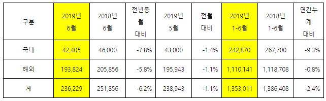 기아차는 2019년 6월 국내에서 전년 동월 대비 7.8% 감소한 4만 2,405대를 판매했다.