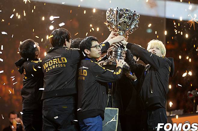 10일(현지시간) 프랑스 파리 아코르호텔 아레나에서 '리그 오브 레전드 2019 월드 챔피언십(이하 롤드컵) 결승전'이 열렸다. 이번 결승에는 LPL 펀플러스 피닉스와 LEC G2 e스포츠가 대결해 펀플러스 피닉스가 롤드컵 로열로더를 차지했다. 펀플러스 피닉스가 우승 트로피를 들어보이고 있다.