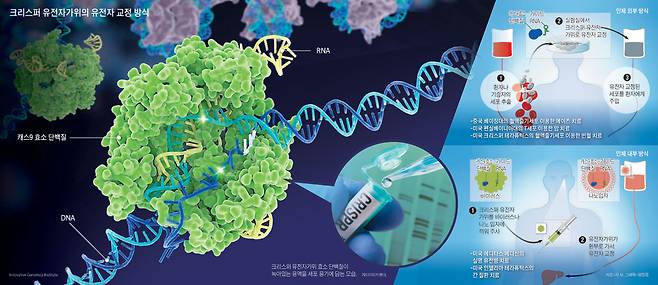 에이즈나 암, 빈혈 치료는 환자의 세포를 꺼내 몸 밖에서 크리스퍼 유전자가위로 질병 유전자를 교정하는 방식이었다. 과학자들은 크리스퍼 유전자가위를 직접 주사해 몸 안에서 유전자 교정을 하는 방식도 시도했다.