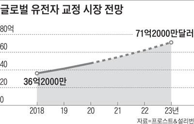 크리스퍼 유전자가위의 임상 시험 결과가 잇따라 나오면서 시장의 기대감도 높아지고 있다. 생명공학정책연구센터에 따르면 지난해 4조2000억원 규모인 유전자 교정 시장은 2023년 8조3000억원 규모로 성장할 전망이다. 이 중 절반 이상이 크리스퍼 유전자가위 시장이다.