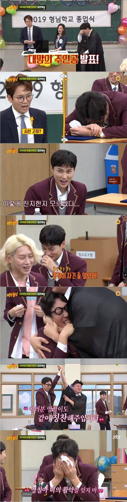 이어 김영철의 두번째 표를 발표하는 성규가 울음을 터트렸고, "아니 시상식인데 왜이래"라는 서장훈이 혼란스러워 했고 수근과 제작진도 다시 울음바다가 됐다. 호동과 영철이 두표씩 받은 가운데 성규가 마지막 표를 개표하면서 "한 사람이 받게 됐다"고 했다. "이유를 먼저 읽어주자면 늘 한결 같은 모습,"이라고 말하는 성규가 영철에게 다가가는 가운데 "축하합니다 강호동"이라고 했다. 호동이 영철을 끌어안았다. 경훈이 "영철형 자긴 줄 알고 있었어"라고 했다. "호동이 2년 연속 아형의 대상이십니다"라고 했다. /anndana@osen.co.kr