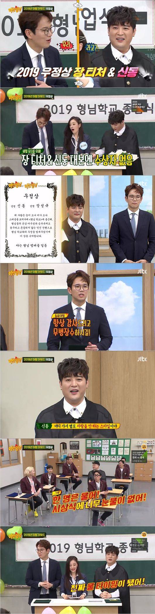 28일 오후 방송된 JTBC '아는형님' 종업식에 아는 형님 어워드 2019의 시상식이 이어졌다. 우정상이 발표 됐다."오 이건 진짜 상이다"라는 희철에 말에 바로 오나라가 "장티처 신동"이라고 호명 했다. 신동이 "아 왜 우리 대본에는 그게 없나 했어"라면서 놀라 했다. "아 없어?" 라는 오나라의 말에 장성규가 "응 우리 대본에는 그게 없어"라고 했다.