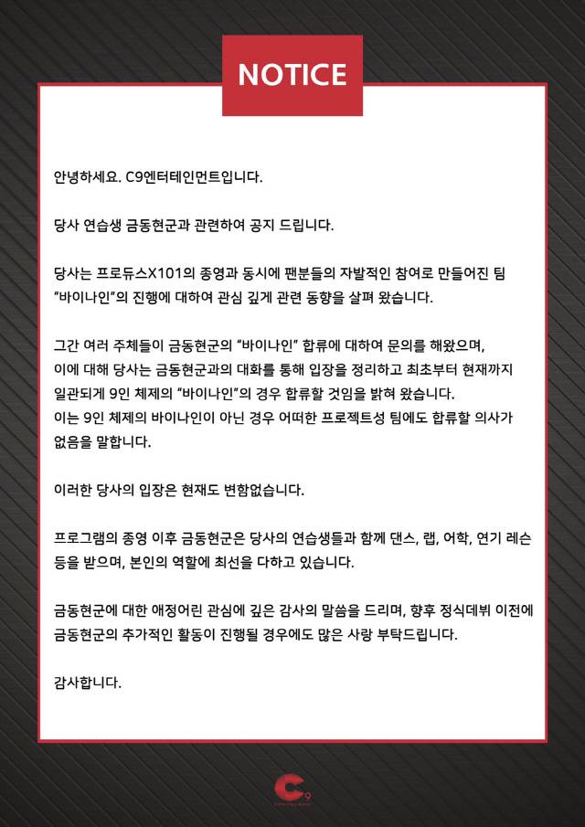 소속사 C9엔터테인먼트(이하 C9)는 13일 공식 SNS를 통해 "금동현과 대화를 통해 입장을 정리하고 최초부터 일관되게 9인 체제 바이나인의 경우 합류할 것임을 밝혀왔다. 9인 체제 바이나인이 아닌 경우 어떠한 프로젝트성 팀에도 합류할 의사가 없다"고 밝혔다.