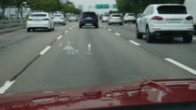 2.6 회전하는 스티어링휠을 조금만 움직여도 크게 반응한다. 정면을 응시하면 자연스럽게 헤드업디스플레이가 보인다. 주행속도, 제한속도, 진행 방향, 좌우 접근 차량 등등 필요한 정보를 넉넉히 담고 있다.