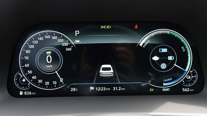 계기판에 표시되는 에너지 흐름에는 솔라패널이 부지런히 전력을 공급하는 모습이 보인다. 방전을 염려할 필요는 없겠다. 12V 배터리 리셋 버튼이 있어서다. 12V 배터리가 방전됐을 때 하이브리드 배터리에서 전력을 보충해 시동을 걸 수 있게 해준다.
