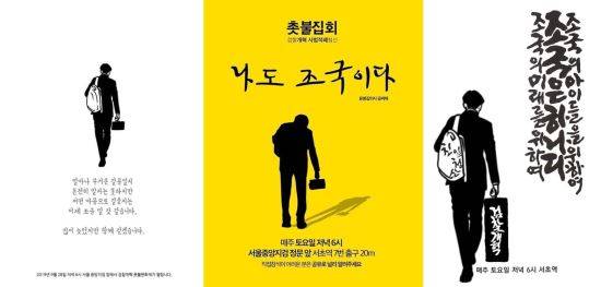 케이크를 든 조 장관의 뒷모습 사진은 다양하게 변주돼 퍼져나가고 있다. 28일 저녁 서울 서초동 대검찰창 앞에서 열리는 검찰개혁 촛불집회에서도 포스터와 깃발 등에 이 이미지가 사용될 예정이다.