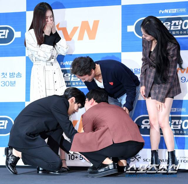 tvN 새 월화 드라마 '유령을 잡아라' 제작발표회가 21일 오후 서울 구로구 신도림동 라마다서울호텔에서 열렸다. 신윤섭 감독의 풀어진 신발끈을 김선호와 조재윤이 묶고 있다. 신도림=박재만 기자 pjm@sportschosun.com/2019.10.21/
