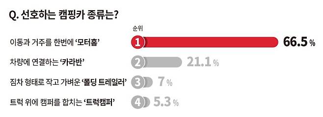 다음으로 선호하는 캠핑카 종류를 묻는 질문에는 이동수단인 자동차와 거주공간인 캠핑카가 결합된 형태의 '모터홈'이 66.5%의 선택을 받으며 1위에 올랐다.