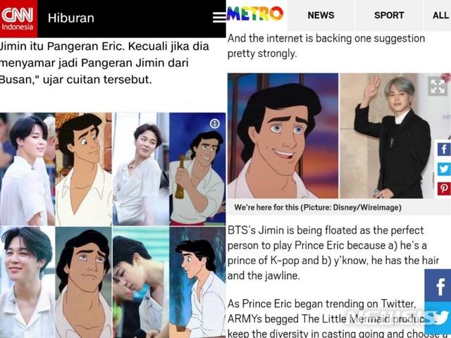 영국 음악전문매체 NME는 지난달 20일 "BTS 팬들이 지민이 디즈니 애니메이션 실사화 시리즈인 '인어공주(The Little Mermaid)'의 에릭 왕자로 캐스팅되기를 원한다"며 SNS 상 팬들의 청원 소식을 보도했다.