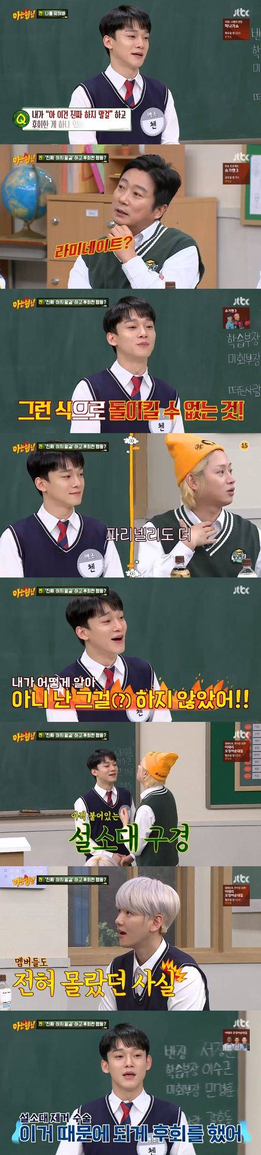 이날 첸은 '진짜 하지 말 걸"하고 후회한 행동을 문제로 냈다. 이어 멤버들도 모른다고 밝혔다. 이에 이수근은 "라미네이트"라고 말해 웃음을 자아냈고 힌트를 내달라고 하자, 첸은 "고등학교 때 내가 노래를 너무 잘하고 싶어서 그랬다. 라미네이트처럼 돌이킬 수 없는 거다"라고 힌트를 줬다.