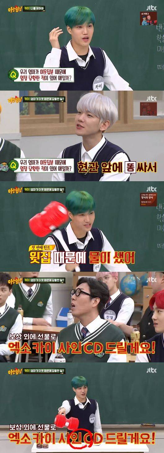 카이는 "우리 엄마가 이웃분 때문에 엄청 당황했던 일이 있다. 물이 샜다. 그런데 뭘 준다고 하셨다"며 질문을 냈다. 이에 백현은 "문앞에 똥을 쌌어"라고 말해 짝꿍인 김희철을 당황케했고 김영철은 "직원인데 엑소 사인 cd 챙겨드릴게요"라고 했다고 말해 정답을 맞혔다.