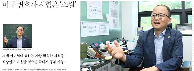 - 생각보다 국내 변호사들이 적은 편이다. "변호사들이 아직도 소송만 하려고 들기 때문이다. 미국 변호사 라이선스가 있으면 국내 변호사가 일할 수 있는 분야가 더 넓어진다. 가령 이민법을 전문적으로 파고들어서 관련 계약서·소개·법률 자문을 맡을 수 있다. 미국과 협업하는 기업에서는 관련 노무 관계 전반을 다룰 수 있다. 한국 변호사 자격증은 오로지 국내용이지만, 미국 변호사 자격증은 글로벌 스탠더드다. 최근 한국 로스쿨 출신들이 연봉도 낮아지고 수임 건수도 떨어지는 추세다. 평소 조금만 더 시야를 넓히고 준비하면 더 넓은 미래가 있다. 이미 야무진 국내 변호사들은 미국 특정 주에서 딴 뒤 다른 주에 가서 변호사 시험을 또 본다. 시험이 다 비슷하니까, 연속성 있게 시험보고 합격해서 자신의 몸값도 올려 가는 것이다."