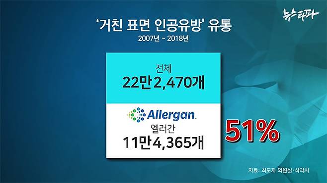식약처가 국회 보건복지위원회 최도자 의원실에 보고한 통계자료를 보면 엘러간의 리콜 제품은 국내 허가를 받은 2007년부터 2018년까지 12년간 11만4365개가 유통됐다. 같은 기간 국내에 유통된 거친 표면 유방보형물 전체 물량(22만2470개)의 절반이 넘는다. 한국엘러간이 식약처에 제출한 회수계획서에 따르면 총 회수 대상은 총 11만 개가 넘는다. 한국엘러간은 미사용 제품의 경우 “직접 방문해 수거한다”고 밝혔지만, 사용되지 않은 재고는 3294개에 불과하다.