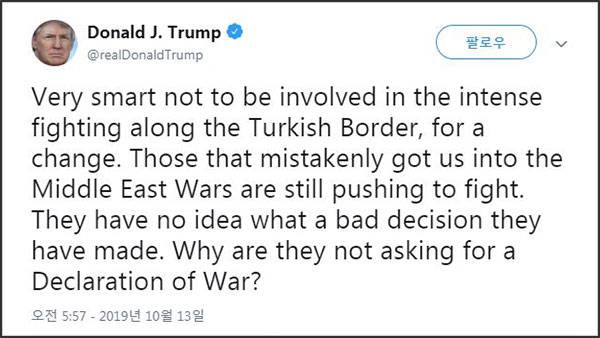 트럼프 대통령은 오늘 새벽 트위터를 통해 "터키 국경에서 일어나는 격렬한 전투에 휘말리지 않는 것이 매우 현명한 일"이라고 밝혔습니다. 또 "우리를 중동 전쟁에 밀어넣은 이들이 여전히 싸우라고 몰아붙이고 있다"면서 "그들은 자신들이 얼마나 나쁜 결정을 내렸는지 모른다"고 덧붙였습니다. 미국이 동맹을 배신했다는 비판에 선을 그었습니다.