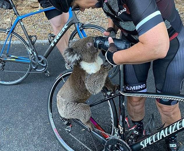 코알라 한 마리가 너무나 목이 마른 나머지 지나가는 자전거를 세우고 물을 얻어 먹는 장면이 카메라에 잡혀 화제를 모으고 있다.
