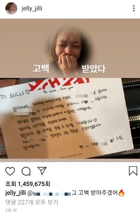설리는 불과 이틀 전에도 자신의 인스타그램에 "그 고백 받아주겠어"라는 글과 함께 짧은 영상을 게재해 웃음을 줬다.