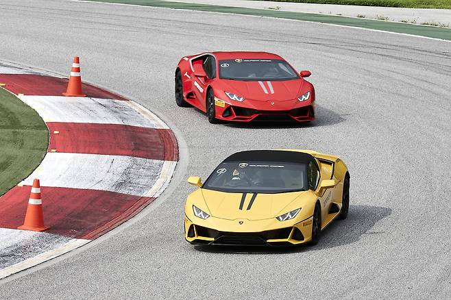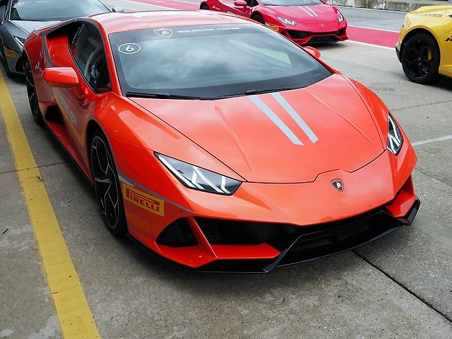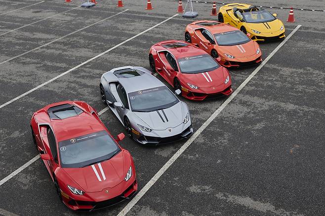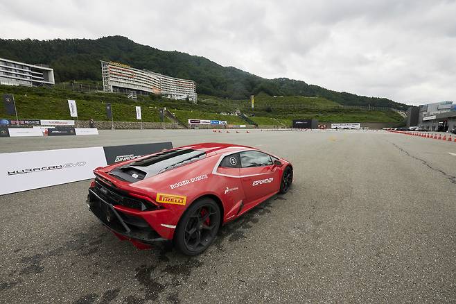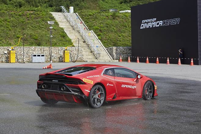 안팎 디자인 감상을 끝내고 운전대를 잡았다. 이날 시승은 짐카나와 트랙 시승, 두 가지로 나눴다. 내가 속한 B조는 짐카나부터 시작했다. 아스팔트 위에 여러 개의 파일런을 세우고 그 사이를 요리조리 피해가는 코스다. 통상 짐카나의 경우 안전상의 이유로 전자장비를 해제하지 않지만, 이날 람보르기니는 장비를 끄라고 유도했다. 심지어 바닥에 물도 흥건히뿌렸다.