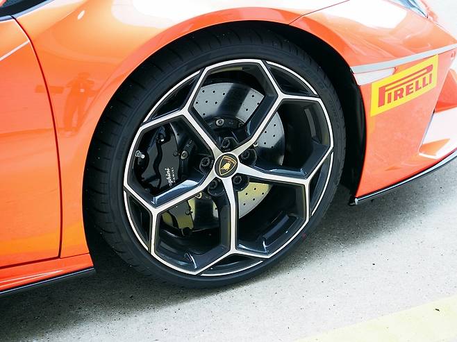 신발도 4가지나 준비했다. 중심은 20인치 단조 휠로, 꽃잎처럼 쭉쭉 뻗은 스포크가 인상적이다. 컬러도 다양하다. 실버를 기본으로 유광 블랙 또는 무광 블랙 등으로 칠할 수 있다. 또한, 브레이크 캘리퍼는 실버나 블랙, 옐로우, 오렌지, 그린, 레드, 블루 등 총 8가지 컬러 가운데 입맛 따라 고를 수 있다. 눈이 즐거운 수퍼카, 우라칸 에보의 또 다른 핵심이다.