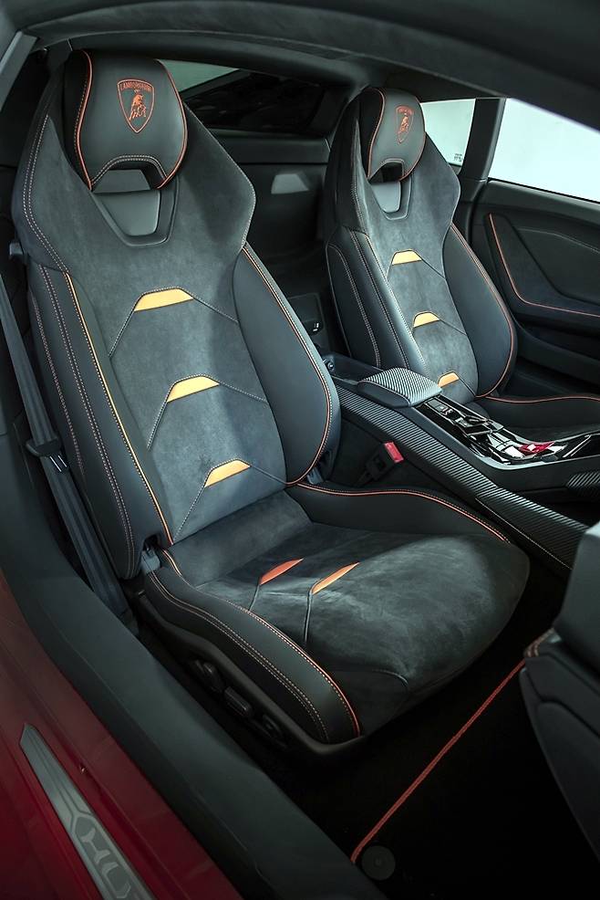 차체 컬러는 무려 40가지를 마련했다. 5개의 일반 솔리드 컬러, 5개의 메탈릭 컬러, 13개의 펄 들어간 컬러, 11개의 매트 컬러, 6개의 스페셜 메탈릭 컬러로 이뤘다. 이렇게 다양한 색상을 제공하는 제조사가 또 있을까? 이 가운데 람보르기니의 새로운 시그니처 컬러인 ‘아란치오 산토(Arancio Xanto)’가 단연 눈에 띈다. 레드에 가까운 채도 높은 주황빛 색상이다.