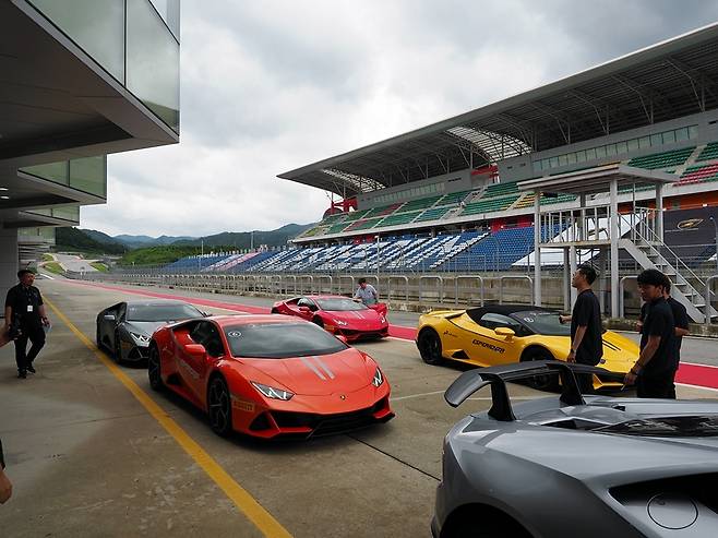 “부아아아아아앙”. 이른 아침, 안개 낀 강원도 인제 스피디움 주변 산길이 절절 끓는 울음소리로 가득 찼다. 새벽부터 출발해 다소 피곤한 상태였지만, 소리 하나로 모든 감각이 쭈뼛 섰다. 패독 앞에 도착하니 이번엔 눈이 휘둥그레졌다. 펄럭이는 람보르기니 깃발 속 듬직한 ‘막내형’ 우루스 2대가 마중을 나왔고, 그 뒤로 형형색색 우라칸 에보들이 줄지어 도열했다.