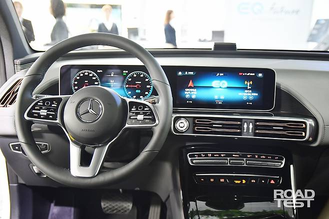 2층으로 올라가 국내 출시한 EQC 400을 만났다. 겉모습은 EQ 콘셉트 디자인에서 크게 벗어나지 않았다. 비전 EQS의 테마를 이어받아 조약돌처럼 매끈하다. 앞은 다른 메르세데스-벤츠 모델과 사뭇 다르다. 헤드램프와 라디에이터 그릴을 한 덩어리로 이었기 때문이다. 앞 범퍼 양쪽의 플라스틱 부품은 실제 구멍 나지 않고 모양만 난 가짜다.
