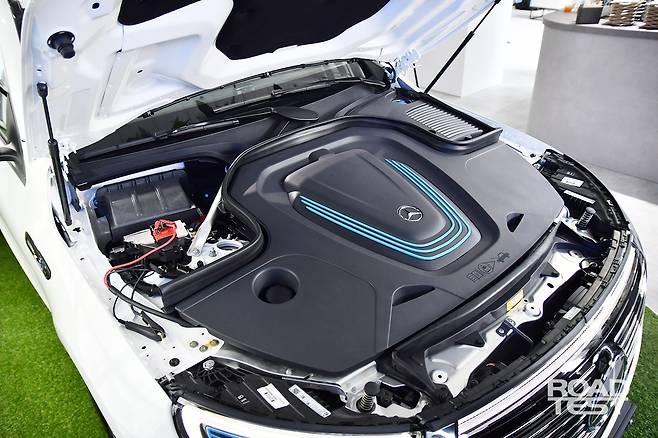 보닛을 열면 큰 플라스틱 커버가 마중 나온다. 커버만 보면 V형 엔진이 떠오르지만, 엔진은 없다. EQC 400은 전기모터를 앞뒤에 얹고 최고출력 408마력, 최대토크 77.4㎏·m를 뿜는다. 0→시속 100㎞ 가속 시간은 5.1초로 빠르지만 최고속도는 시속 180㎞에 그친다.