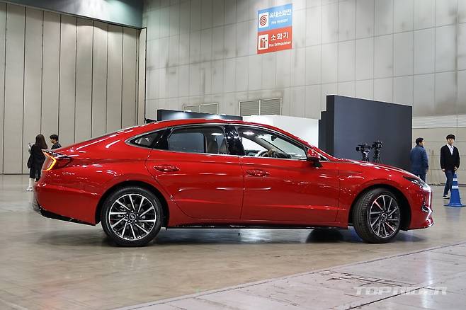 측면은 K5는 루프라인을, 쏘나타는 전체적인 볼륨감을 강조하고 있다. K5는 1세대부터 이어진 시그니처 디자인의 C필러를 강조하는 한편 세단임에도 패스트백 스타일을 적용했다. 쏘나타는 도어 상단과 하단에 굵은 캐릭터 라인과 함께 리어펜더 볼륨감을 강조했다.