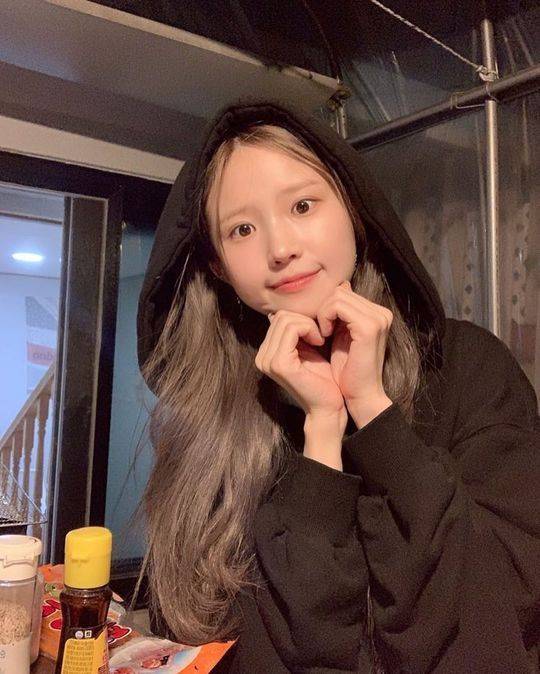 사진 속 송하영은 후드집업 모자를 쓰고 하트를 하고 있다.