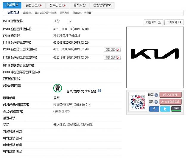다만, 6월에 첫 등록된 4건 중 1건이 지난 2일, 등록번호와 출원공고번호 등을 최종 부여받아 상표권이 최종 승인됐다. 해당 이미지는 앞서 기아차가 '2019 제네바모터쇼'를 통해 선보인 '이매진 바이(Imagine by KIA)' 콘셉트카에 부착된 것과 거의 동일한 패턴이다. 차세대 크로스오버 EV 콘셉트카를 지향해 개발된 '이매진 바이 기아'는 미래 전기차의 새로운 가능성을 제시하는 모델로 단순히 첨단 기술들을 대거 탑재하는 것에 그치지 않고 운전자의 감성적인 부분까지 충족시킬 수 있도록 인간지향적 디자인이 적용됐다.