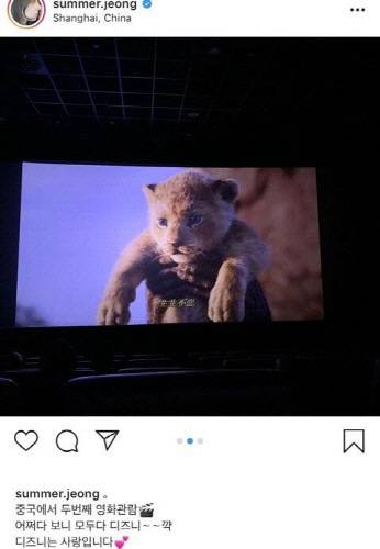 현재 개인 일정으로 중국에 머물고 있는 정선아는 국내 관객들보다 먼저 '라이온 킹'을 접했고 불법 촬영으로 논란의 중심에 섰다.