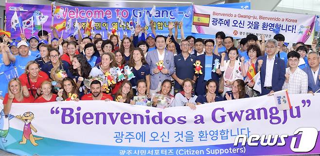 (광주=뉴스1) 박준배 기자 = 이용섭 광주시장과 광주시민서포터즈가 7일 전남 무안국제공항에서 열린 광주세계수영선수권대회 스페인 선수단 환영행사에 참석해 스페인 선수단, 시민 서포터즈와 함께 기념촬영을 하고 있다.(광주시 제공)2019.7.7/뉴스1