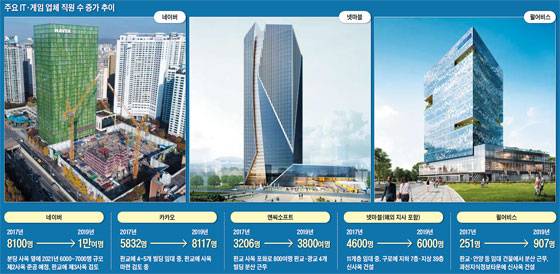 성장이 정체된 제조·유통 분야 국내 대기업들은 기존 사옥을 잇따라 매각하고 있지만, 성장세가 뜨거운 국내 IT(정보기술)·게임 업계에서는 신사옥 건설 경쟁이 한창이다. 불황으로 인력을 내보내거나 공장과 사옥을 매각하는 제조업계와 대조적으로 이들은 최근 5~10년 새 직원이 2~3배씩 늘면서 업무 공간 부족 사태를 겪고 있기 때문이다. 4차 산업혁명 시대에 걸맞은 스마트·인텔리전스 빌딩을 확보해 신사업을 가속화하고 업무 효율을 높이겠다는 전략까지 더해진 신사옥 전쟁은 판교·구로·과천 등의 스카이라인을 흔들고 있다.