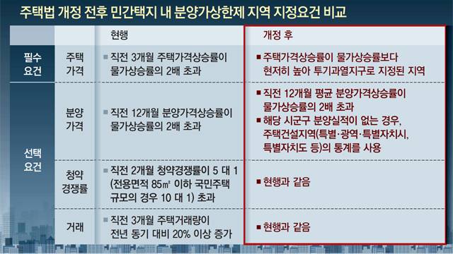 정부는 이번에 분양가상한제 적용 시점을 관리처분계획 인가 시점에서 입주자모집 승인 시점으로 늦추기로 했다. 입주자모집 승인 신청은 관리처분계획 인가 시점보다 통상 1∼2년 이후에 진행되는 만큼 그 사이에 주택법 시행령 개정안이 시행되면 분양가상한제 적용 대상도 늘어나게 된다.