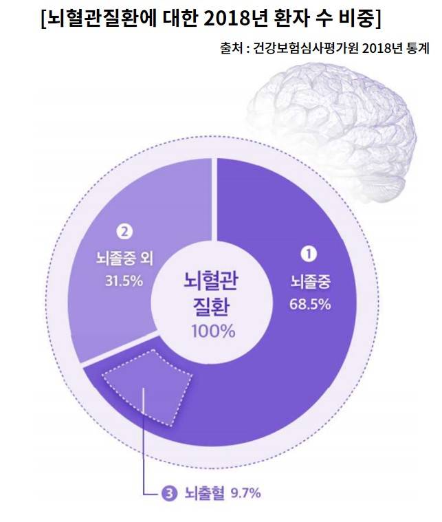 건강보험심사평가원 통계에 따르면 2018년 뇌혈관질환 발병환자는 약 105만명이다.