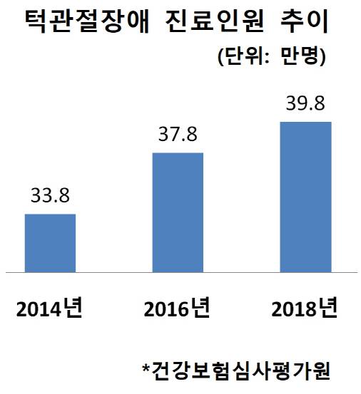지난해 국내 턱관절장애 진료인원은 39만8,400여명으로 2014년 약 33만8,300명보다 18% 증가했다. 여성이 23만6,300여명(59%)으로 남성보다 1.46배 많다. 연령대별로는 20대가 28%로 가장 많고 10대·30대를 합하면 59%를 차지한다.