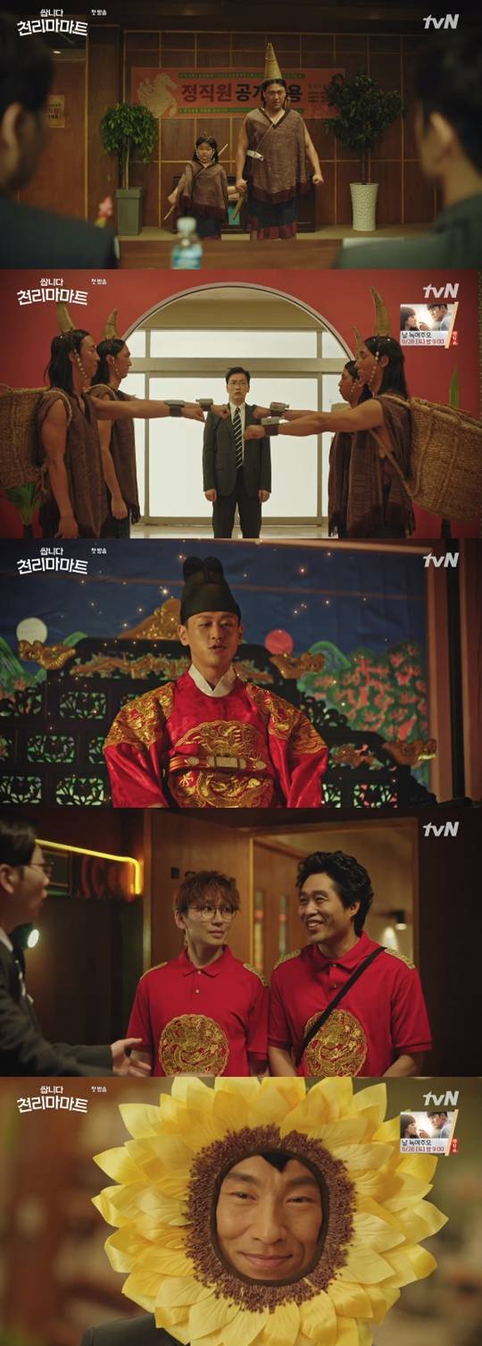 이처럼 1회부터 코믹한 설정과 폭소만발 분장을 자랑하며 원작을 능가한 재미를 선사한 '쌉니다 천리마마트'. 한 시청자는 "웹툰 보고서 드라마로 만들기 쉽지 않다고 생각했는데 예상보다 훨씬 잘 살렸다. 마지막에 김병철 씨 해바라기 보고 빵 터졌다"는 소감을 전했다. 또 다른 시청자 역시 "진짜 너무 재밌었다. 얼마만에 이렇게 웃어본지 모르겠다"고 극찬했다.(사진=tvN 새 금요드라마 '쌉니다 천리마마트' 캡처)