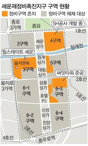 다만 상당수 구역이 도시정비법상 '토지 등 소유자가 정비구역으로 지정·고시된 날부터 5년이 되는 날까지 사업시행계획 인가를 신청하지 않은 경우'에 해당돼 올해 3월 26일자로 일몰 대상이 됐다. 세운지구는 상업지역이지만 구역 통합이 안 되면 일조 등 문제 때문에 고밀 개발이 사실상 불가능하다. 또 정비구역에서 해제되고 빌라 등이 들어서면 노후 건축물 비율 문제 등 때문에 다시 정비구역으로 지정되기는 어렵다.