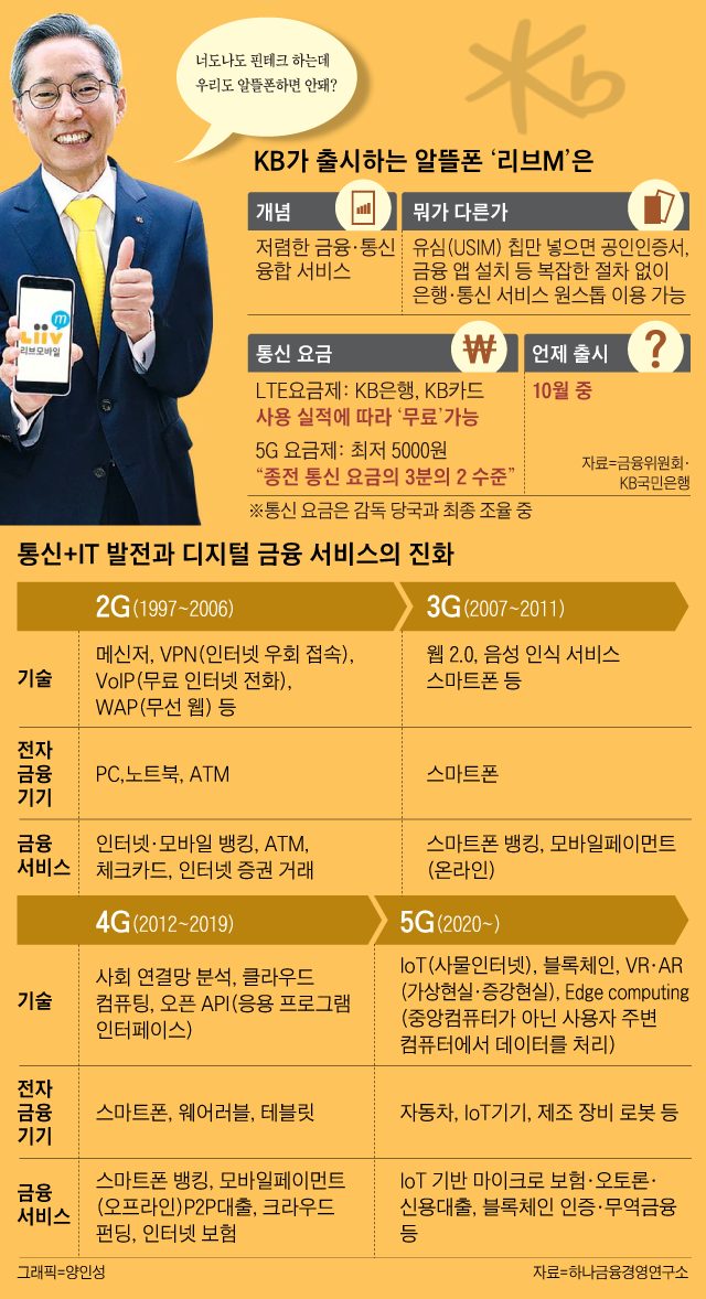 KB금융이 10월 중에 LG유플러스 통신망을 이용한 MVNO(가상이동통신망) 서비스, 일명 '알뜰폰' 사업에 진출한다. 5G 요금제는 최저가 5000원, LTE 요금제는 최저 무료로 제공될 예정이다. 브랜드는 국민은행 디지털금융 브랜드 '리브(Liiv)'와 모바일의 M을 합친 '리브M'으로 정해졌다. KB의 신사업 진출 소식에 통신업계와 금융업계는 발칵 뒤집혔다. 경쟁 은행들이 염치 불구하고 직접 자초지종을 묻기도 했다. 지난 2년간 KB금융이 비밀리에 진행한 신사업 프로젝트가 곧 세상에 나올 채비를 마쳤다.