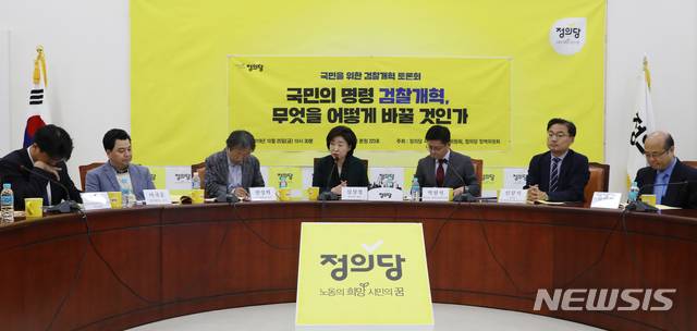 【서울=뉴시스】김명원 기자 = 심상정 정의당 대표가 25일 오전 서울 여의도 국회 정의당 회의실에서 열린 검찰개혁 토론회에서 모두발언을 하고 있다. 왼쪽부터 김준우 민주사회를위한변호사모임 사무차장, 이국운 한동대학교 교수, 한상희 건국대학교 교수, 심상정 대표, 박원석 정책위의장, 신장식 정의당 사법개혁특위위원장, 성한용 한겨레 기자. 2019.10.25.