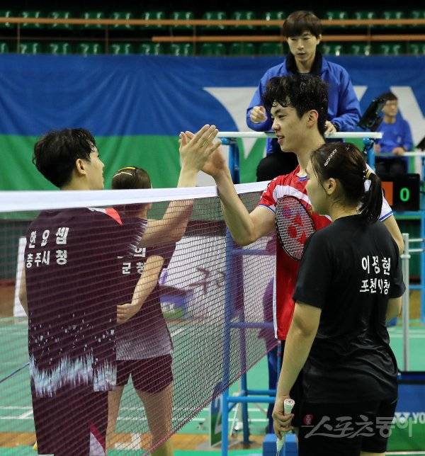 일반혼합복식 준결승 한요셉-이승희 조와 김영혁-이정현 조의 경기에서 김영혁-이정현 조가 풀세트 접전 끝에 승리를 거두며 결승에 진출했다. 김영혁과 한요셉(왼쪽)이 경기 후 인사를 나누고 있다.