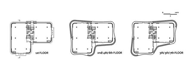 이러한 곡면의 리듬감 있는 변화는 발코니의 리듬감 있는 변화를 낳고 오피스 공간 사용자의 만족도를 높여준다. 각 층별 발코니 끝 지점에는 플랜트 박스에 사철나무를 조경하여 건물 전체에 싱그러움을 유도한다. 데크와 곡선형 길로 형성된 중앙 마당의 자연스러운 조경과 휴식 공간으로 꾸며진 외부 조경 시설과 어우러져 오피스 외부 공간에 활력을 불어넣고 있다.