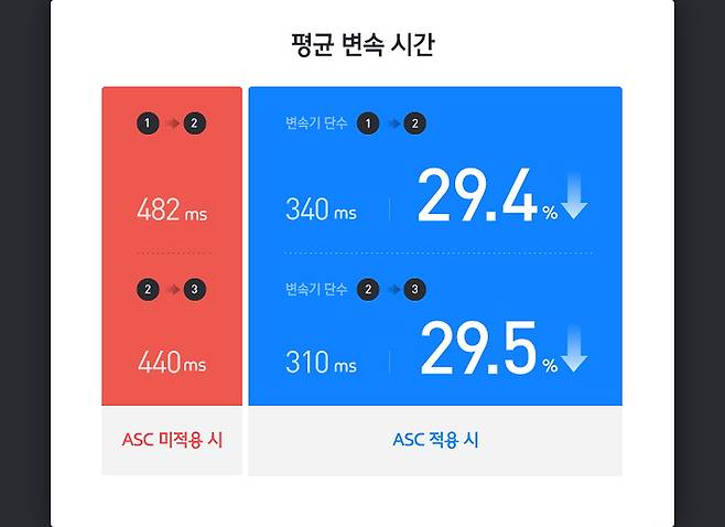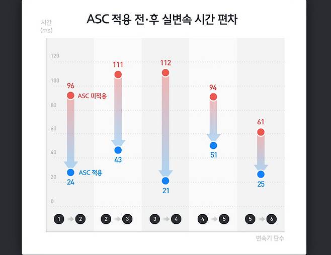 현대차그룹이 독자 개발한 ASC 제어 로직은 하이브리드차를 구동하는 주행 모터를 활용해 자동변속기를 초당 500회씩 초정밀 제어하는 신기술이다. 이를 통해 기존 하이브리드차 대비 30% 빠른 변속이 가능해져 주행 성능은 물론 연비와 변속기 내구성을 함께 높인다.
