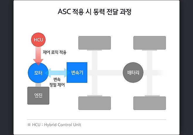 하지만 ASC 기술이 적용되면 별도의 추가 장치 없이 하이브리드 제어기(HCU)의 로직만으로 주행 모터가 변속기까지 콘트롤하기 때문에 기존 하이브리드차의 단점을 상당 부분 줄여준다. 또한 변속시 엔진과 변속기의 다른 회전 속도를 ASC 제어 로직이 보정한다.