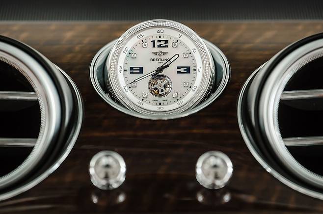 최고급차 벤틀리는 파트너로 스위스제 고급시계 브랜드 브라이틀링을 선택했다. 양사는 평소에도 벤틀리와 브라이틀링이 콜라보 된 손목시계를 발매하고 있다. 차량에 탑재되는 모델은 기본적으로 쿼츠(전지식 또는 전기식) 방식이며, 브라이틀링의 자랑인 최상급 기계식 시계인 ‘뚜르비용’이 옵션으로 준비돼 있다.