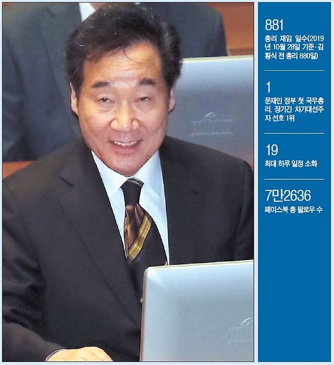 ▶“유능한 내각에 가장 낮은 총리 되겠다”=이 총리는 취임당시 그다지 존재감을 드러내지 못했다. 하지만 첫 대정부 질문부터 이른바 ‘사이다발언’ 등으로 대중적 조명을 받기 시작했다. 무엇보다 이 총리의 업무스타일은 만기친람(萬機親覽·모든 일을 직접 다스림) 식으로, ‘깨알 지시’로도 유명하다. 또 국무위원이나 총리실 간부들이 현안에 대해 제대로 답하지 못하거나 행정편의주의적인 대책을 내놓으면 질책을 내놓는다. 때문에 ‘군기반장’, ‘교장선생님’으로 통하기도 한다. 이 총리가 취임당시 ‘유능한 내각을 만들겠다’고 한 대 국민 약속을 이행하기 위한 궁여지책인 셈이다.