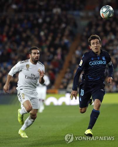 epa08020725 Real Madrid's defender Dani Carvajal (L) in action against Real Sociedad's winger Mikel Oyarzaba (R) during the Spanish LaLiga soccer match between Real Madrid and Real Sociedad at Santiago Bernabeu stadium in Madrid, Spain, 23 November 2019. EPA/Ballesteros