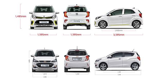 경차 규격을 빠듯하게 채웠다 . 길이×너비×높이가 3,595× 1,595× 1,485mm로 서로 같다 . 앞 , 뒤 바퀴 사이의 거리는 모닝이 근소하게나마 길다 (모닝 : 2,400mm, 스파크 : 2,385mm). 트렁크 공간 역시 스파크는 190L인데 반해 모닝은 255L로 조금 더 여유롭다 .