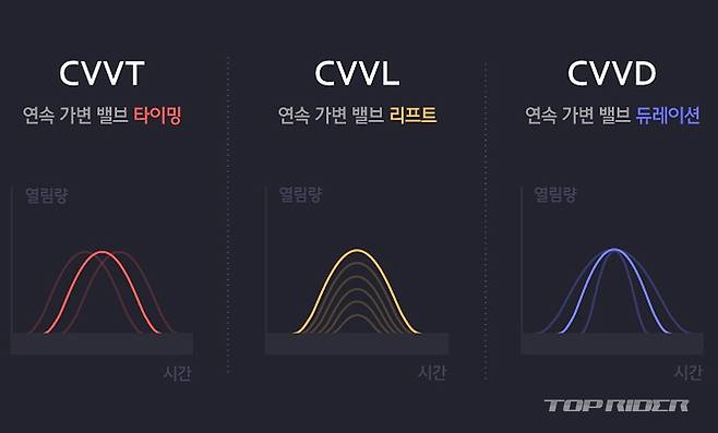 현대차가 세계 최초로 개발한 CVVD는 밸브 열림 시간을 제어함으로써 엔진의 성능과 연비를 동시에 향상시키면서 배출가스까지 줄이는 기술이다. CVVD 외에도 저압 배기가스 재순환 시스템(LP EGR), 통합 열관리 시스템(ITMS), 350바 직분사, 저마찰 설계가 적용됐다.